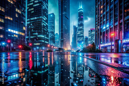 Obraz premium Moody urban nightscape captures city's sleek skyscrapers shimmering with raindrops on glass window, neon lights reflecting off wet pavement, darkness illuminated by city glow.