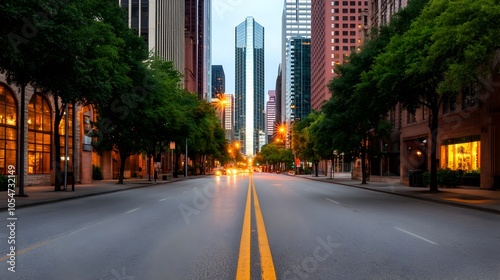 © Srinard, Fototapeta premium Moody urban street at night with neon lights casting colorful glows on towering skyscrapers illuminated windows and a quiet city landscape