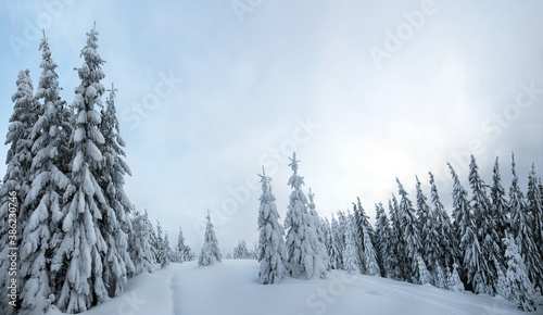 Obraz premium Moody winter landscape of spruce woods cowered with deep white snow in cold frozen mountains.