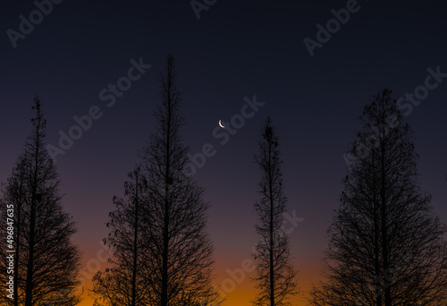 © Christopherab, Fototapeta premium moon between trees at sunrise