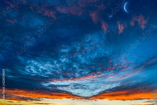 © yaalan, Fototapeta premium Moon in bright clouds of sunset sun . New moon