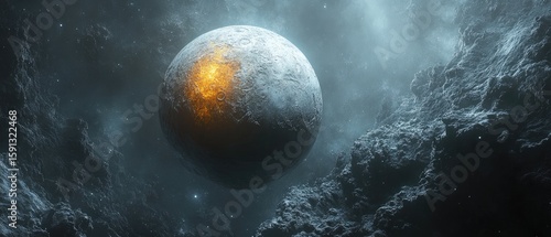 Fototapeta premium Moon-like orb glowing with light, amid dark, rocky landscape in a foggy...