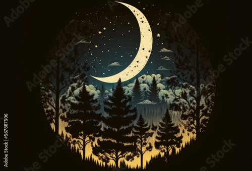 Fototapeta premium Moon nightscape, waxing waning crescent moon phase, with silhouetted pine trees in the woodland and a crescent moon in the nighttime sky. Generative AI