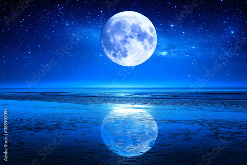 © Siasart, Obraz premium Moon Reflects on Calm Ocean at Night with Stars