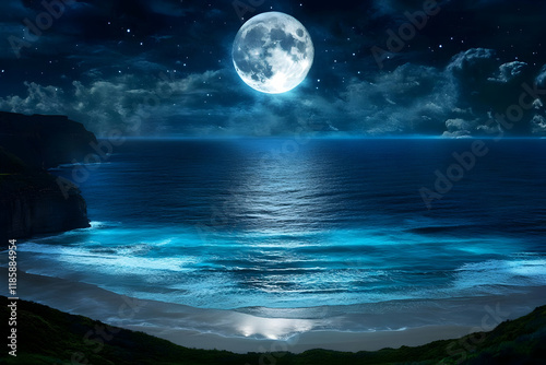 © Siasart, Fototapeta premium Moon Shines Over Ocean Waves, Cliffs, and Beach at Night
