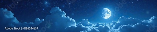 Obraz premium Moonlight casting an ethereal glow on a star-filled sky with wispy clouds,...