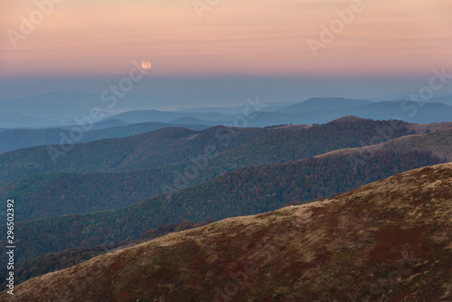 Naklejka premium Moonlight in the Ukrainian Carpathians on a mountain ridge with a red tourist...