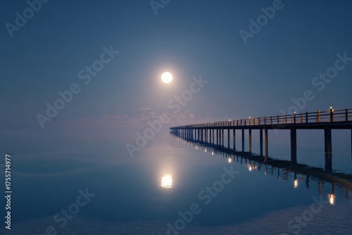 Obraz premium moonlight reflecting on calm ocean horizon, modern villa silhouette glowing,...