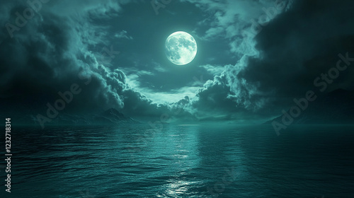 © Sadia, Fototapeta premium Moonlight reflecting on calm water with dramatic clouds at night