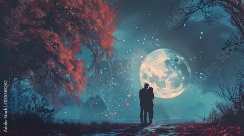 Fototapeta premium Moonlit Embrace: A romantic silhouette of a couple embracing under a large, luminous full moon, surrounded by a mystical forest with glowing red leaves. The scene evokes feelings of love, mystery.