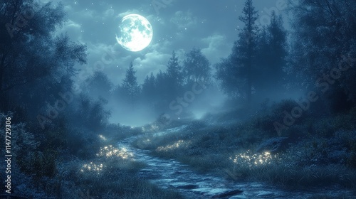 Fototapeta premium Moonlit forest path, glowing flora, mystical night.