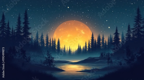 Naklejka premium Moonlit Forest Serenity, a tranquil scene of a minimalist forest under a...