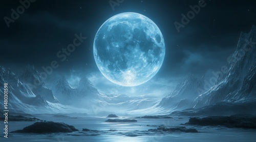 © Jikno, Fototapeta premium Moonlit, misty mountains, light, and night sky