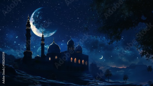 © Atmospheric stock, Naklejka premium Moonlit mosque: nighttime oasis under a starry sky with crescent moon