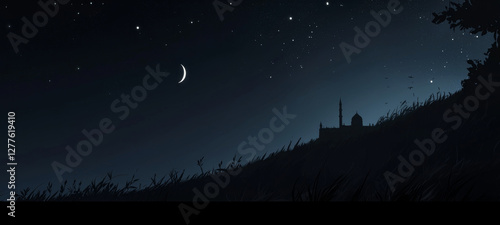 Naklejka premium Moonlit Mosque Silhouette in a Starry Night