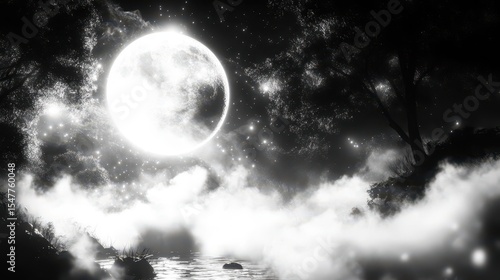 Fototapeta premium Moonlit Night, Misty Lake, Starry Sky