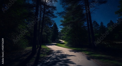 Fototapeta premium Moonlit Path Serene Night Walk Through Tranquil Forest Landscape with Shadows and Mystery