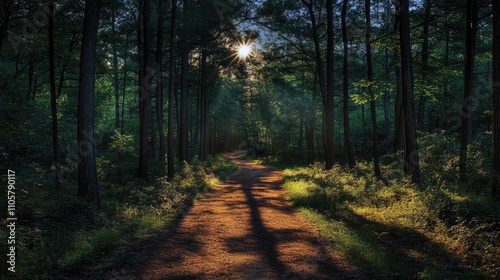 © Timeless Touch, Obraz premium Moonlit path through a forest with tall, dark trees casting long shadows and the trail glowing faintly