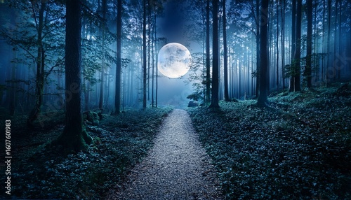 Naklejka premium moonlit path through a serene forest at night with soft illumination and...