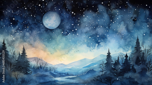 © Karl, Naklejka premium Moonlit Starry Watercolor Night Sky