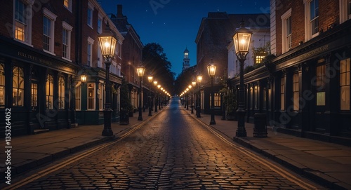 © Earl, Fototapeta premium Moonlit Victorian street with gas lamps and cobblestone pavement