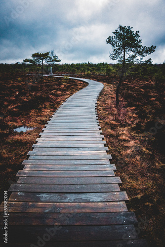 Fototapeta premium Moor, Moorweg, Weg, Bohlenweg, Schwarzes Moor, nass, Regen, Moor