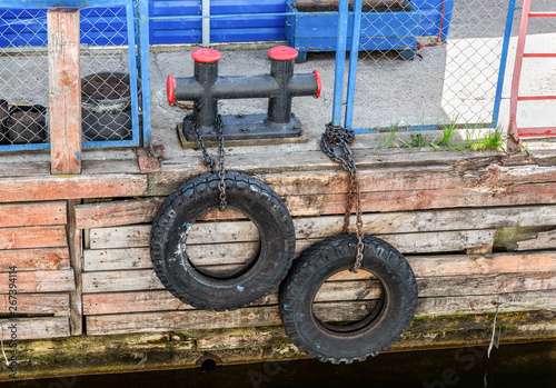 © Alexandr Blinov, Fototapeta premium Mooring metal bollard with a tires at the pier
