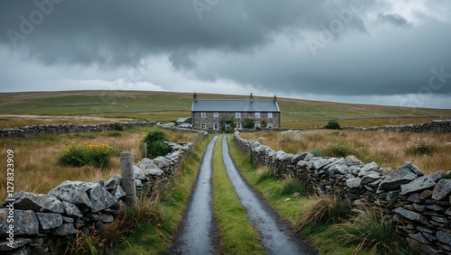 Fototapeta premium Moorland Road Leading to Farmhouse Surrounded by Stone Walls, Wild Flora, and Dramatic Rain Clouds in the Background
