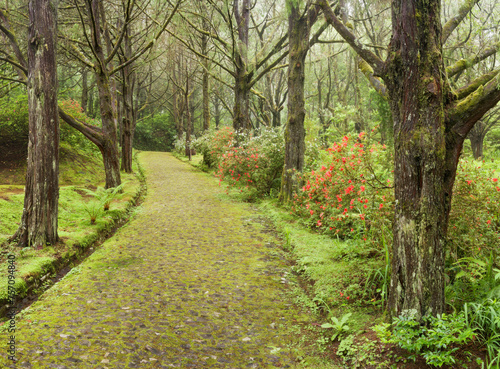 Fototapeta premium moosbewachsene Strasse, Wald, Caldeirao Verde, Queimados, Madeira, Portugal
