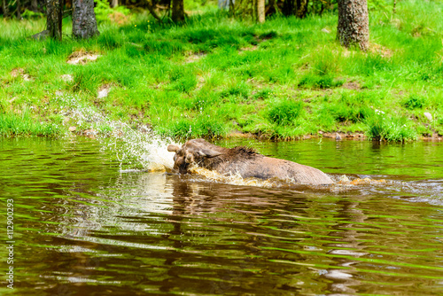 Fototapeta premium Moose (Alces alces). A bull is having a playful time splashing around in the forest lake.