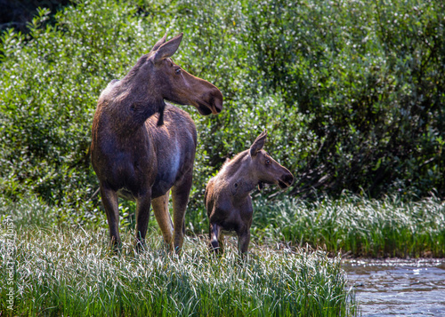 © Benny, Fototapeta premium Moose cow and calf posing in Glacier National Park