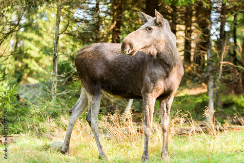 © imfotograf, Fototapeta premium Moose cow standing in spruce forest clearing looking and listening behind her.