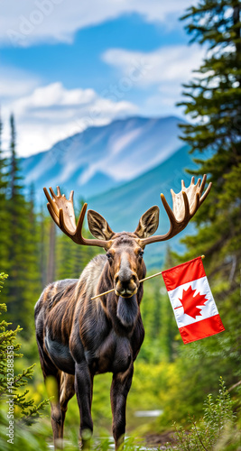 © KAI, Naklejka premium Moose Holding Canadian Flag in its Mouth For Canada Independence Day National Holiday Celebration With Canadian Nature Landscape in the Background