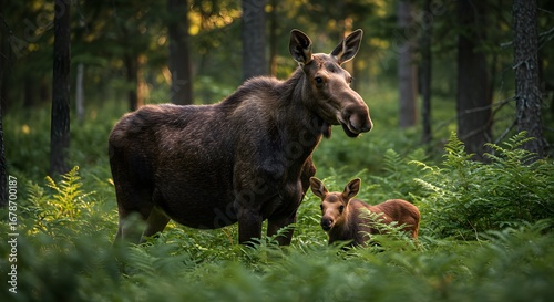 © Banjir, Fototapeta premium Moose mother and calf in forest