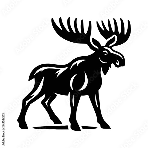 Fototapeta premium Moose Standing on White Background in Black Silhouette Vector Illustration Style with Antlers