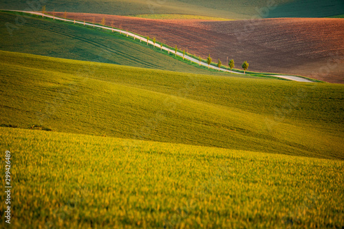 Obraz premium Moravian fields in spring time, green and yellow landscapes in Czech Republic...