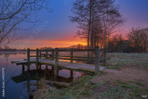 © Maik Richter, Fototapeta premium Morgens am Steg / Sonnenaufgang über dem Thielenburger See in Dannenberg (Landkreis Lüchow - Dannenberg, Niedersachsen, Deutschland). Aufgenommen am 19. März 2017.