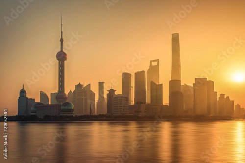 Fototapeta premium Moring view of shanghai skyline and huangpu river with sunrise glow