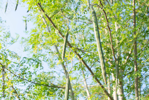 Obraz premium Moringa drumstick hanging on a Moringa tree. Miracle tree. Selective focus