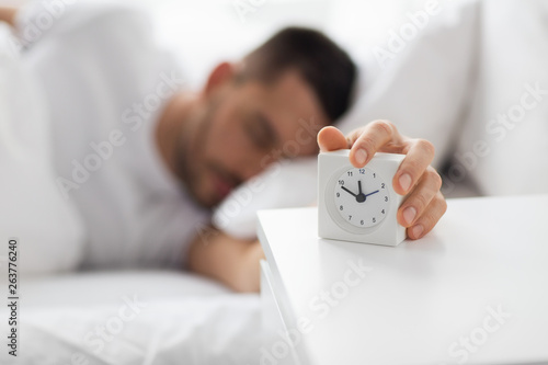 © Syda Productions, Naklejka premium morning and people concept - close up of sleepy young man in bed reaching for alarm clock on bedside table at home