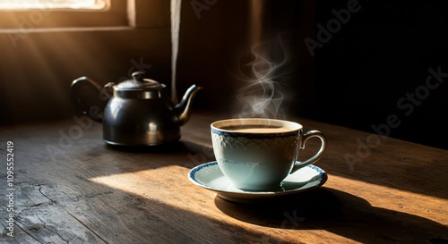 © Kenny, Obraz premium Morning coffee on a rustic wooden table with sunlight streaming through the window
