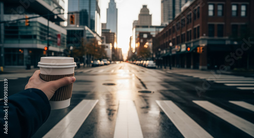 Obraz premium Morning Coffee on Empty City Street at Sunrise