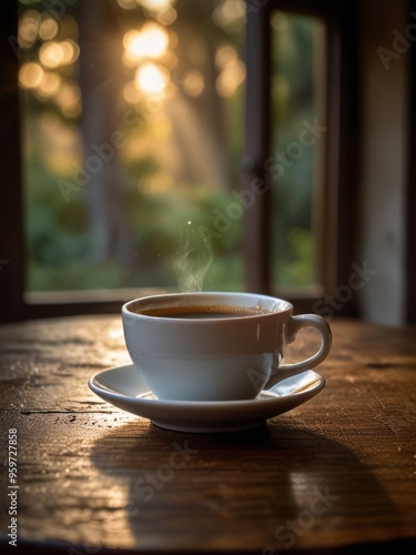 © YudhiaAsta, Obraz premium Morning Coffee with a Mountain View