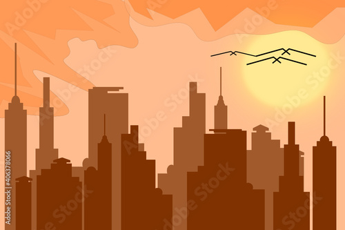© hadi_sasmito, Fototapeta premium Morning, day city skyline landscape, town buildings in different time and urban cityscape town sky. Daytime cityscape. Architecture silhouette downtown vector background. Flat design