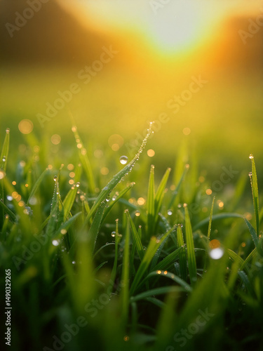 Fototapeta premium Morning dew glistens on green grass as sunlight breaks through the horizon in...