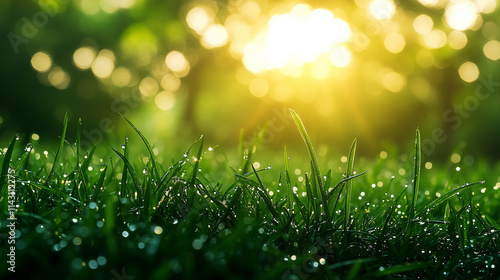 Obraz premium Morning dew glistens on vibrant grass blades during early sunrise in a lush...