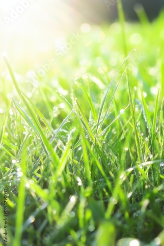 Fototapeta premium Morning Dew on Lush Green Grass Illuminated by Warm Sunlight.