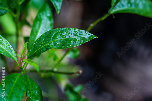 Fototapeta premium Morning dew on the surface of tropical green leaves