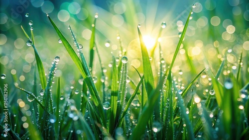 © parichart, Fototapeta premium Morning Dew on Vibrant Green Blades of Grass, Illuminated by the Warm Glow of the Rising Sun