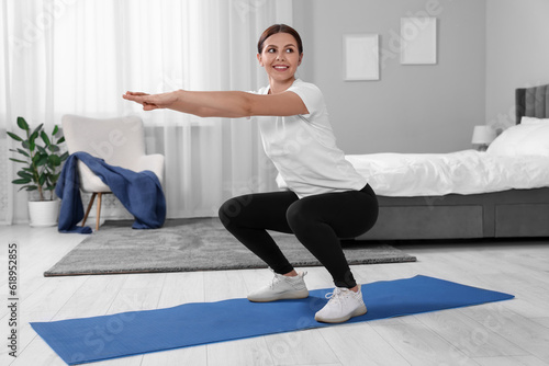Fototapeta premium Morning exercise. Happy woman squatting at home